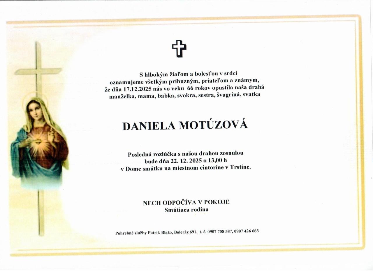 Posledná rozlúčka so zosnulou bude 22.12.2025 o 13,00hod. na miestnom cintoríne v Trstíne
